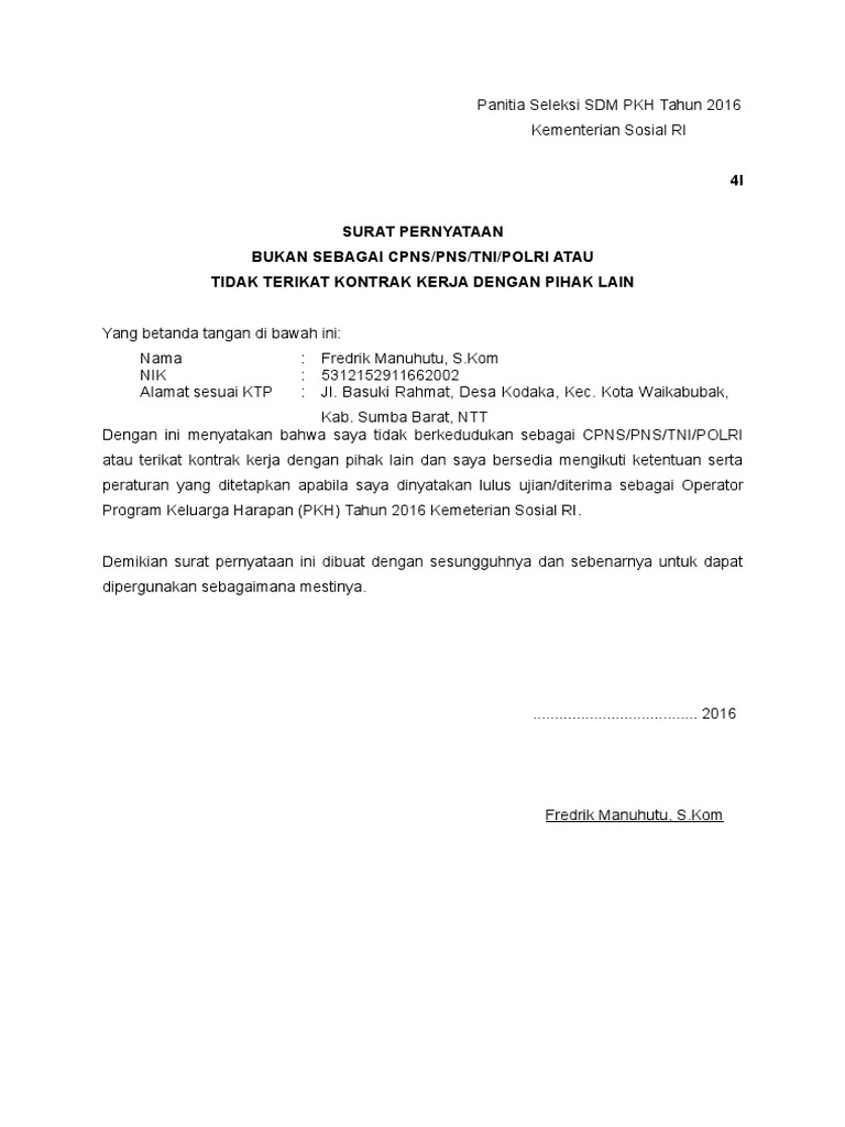 Http Sastra Um Ac Id Wp Content Uploads 2017 02 2017 02 02 10 06 56 01 Pdf from Tidak sedang terikat kontrak dengan instansi/perguruan tinggi lain dan apabila ternyata pada waktu melamar dengan sengaja memberikan keterangan atau bukti . Surat pernyataan tidak berstatus pns dan tidak terikat instansi / 5 contoh surat pernyataan dan cara pembuatannya : Demikian pernyataan ini saya buat dengan sebenarnya untuk . Menyatakan dengan sesungguhnya bahwa saya bukan pegawai negeri sipil ( pns )/tni /polri. Demikian surat pernyataan ini saya buat dengan sesungguhnya dan apabila dikemudian hari ternyata pernyataan saya tidak benar, maka saya bersedia dituntut . Tidak berstatus sebagai pegawai negeri sipil pada pemerintah. Surat pernyataan tidak terikat hubungan keluarga dengan bupati / wakil bupati . Surat pernyataan tidak berstatus sebagai pns/aparatur sipil negara (asn) (.
